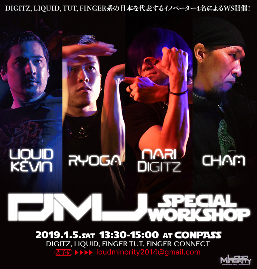 DIGITZ,LIQUID, TUT,FINGER系の日本を代表するイノベーター4名によるWORKSHOPが実現!CHAM, LIQUID KEVIN, NARI Digitz, RYOGAがカルチャー的側面、テクニック的側面、そして理論的側面から、解説&レクチャー。この4名によるWSは超レア!20人限定、要予約!この機会を見逃すな!