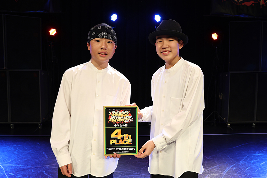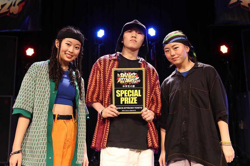 大人顔負けのスキルを持つチームや、中学生らしい愛嬌のあるチーム、中学最後のコンテストのチームなど、個性的なチームが多く、選曲や踊り、そして気持ちが踊りの中に具体化されていて、見ててとても面白かったです。青春をすごく感じました!!ただ全体的に、あれもやりたい、これもやりたい!といった感じでショーの流れが少し散らかってしまっている印象も受けました。色々な表現ができることは素晴らしいですが、もう少し音の流れ、フリの流れ、展開、フロウも意識した方が、もっと良くなるチームがいっぱいあるなと感じました。入賞したチームは、チームのメンバー1人1人にしっかりスキルを持つチームが上位に上がってきた印象でした。それでいて流れも綺麗で、見ててあっという間に終わってしまった、もっと見たいと思わせてくれたチームが入っているのかなと思います。また音の雰囲気を素直に表現し、しっかり伝えてきたチームが印象に残っています。大人数のチームはまだダンス力が身についていない人も見受けられたので、まだまだ諦めずどんどん練習していってほしいなと思います。仲間がたくさんいることは本当に素晴らしいことです!それぞれ自分たちの良いところと、良くなかったところを客観的にしっかりと見極め、長所を伸ばし、弱点、スキのないように改善していってほしいなと思いました。入賞チーム以外では、「BUBBLES」はショーはシンプルながらも2人の信頼感がすごく伝わってきて好きでした。より客観的に流れを意識して作品作りをしていけばもっと良い印象になったと思います。「Talisma」はチームの色、空気感があってよかったです。正直なところ、コンテスト向きではない選曲かもしれませんが、逆にそういったチームが勝ち上がるところを見てみたいとなぁと思いました。「BEE VOYAGE」はナチュラルな流れの中に力強さを感じ気合い入っている感じが好きでした。個々のオリジナル感ともう一つ見せ場があればもっと良くなると思います。「RAQURO+SHIKI」も綺麗な流れで見ていて気持ちよかったです。お客さんを自分たちのショーに引き込むような工夫があればより素敵になるなぁと思いました。「nought」もシンプルにカッコいいと思ったチームです。このまま追求していってほしいと思います。「Otsuma J Crew」は初っ端でしたが全員Breakingで、さらに面白いルーティーンで単純に驚きました。スキルはまだまだですが、他チームと被らない特別感があるので、ぜひ続けていってほしいです。